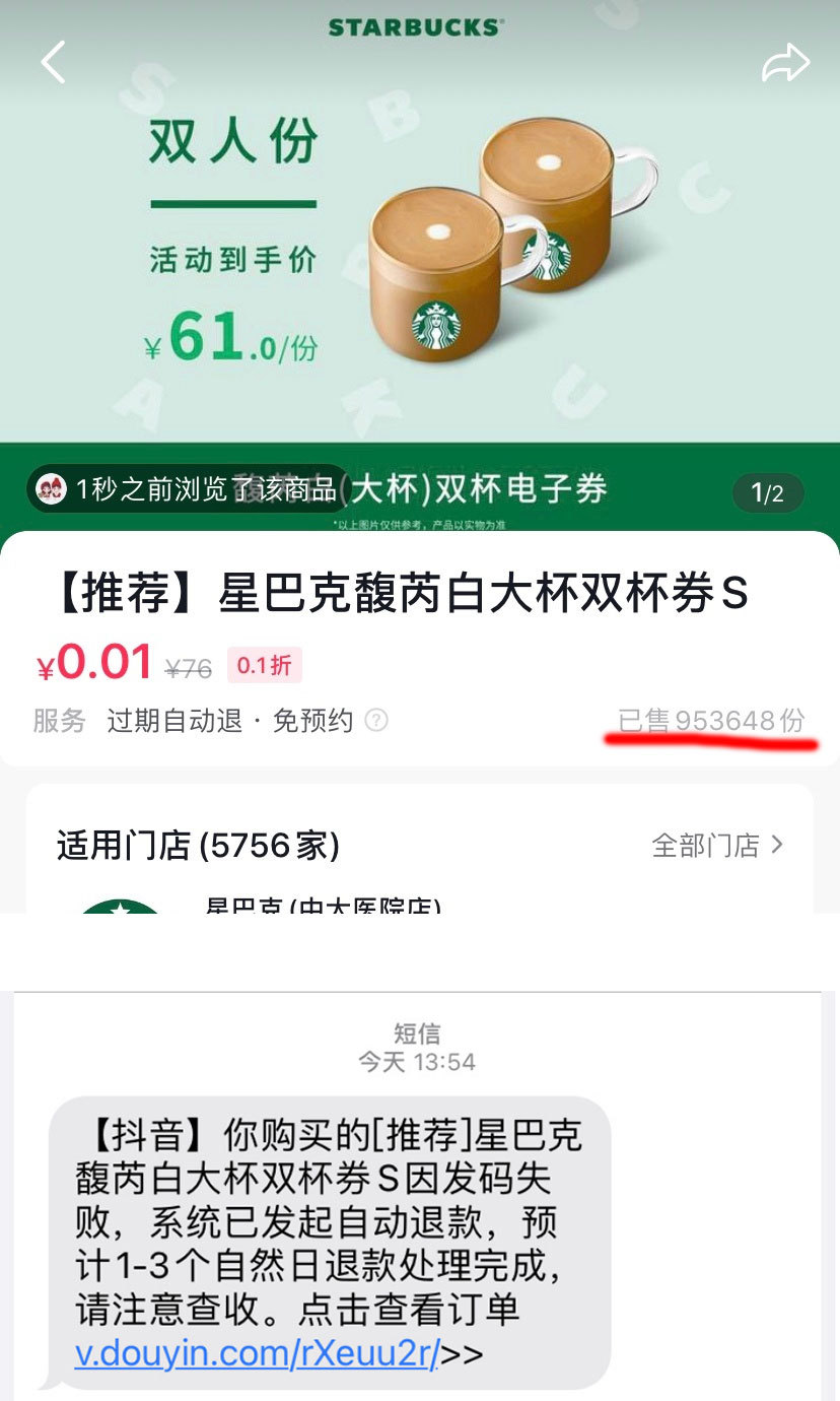 央廣網(wǎng)記者注意到,23日有多名網(wǎng)友在社交平臺微博反饋,星巴克近日在某平臺推出0.01元購2杯馥芮白咖啡券團購活動,賣出95萬多單。但是不少消費者表示搶券后,發(fā)現(xiàn)無法兌換,被星巴克自動退款了。