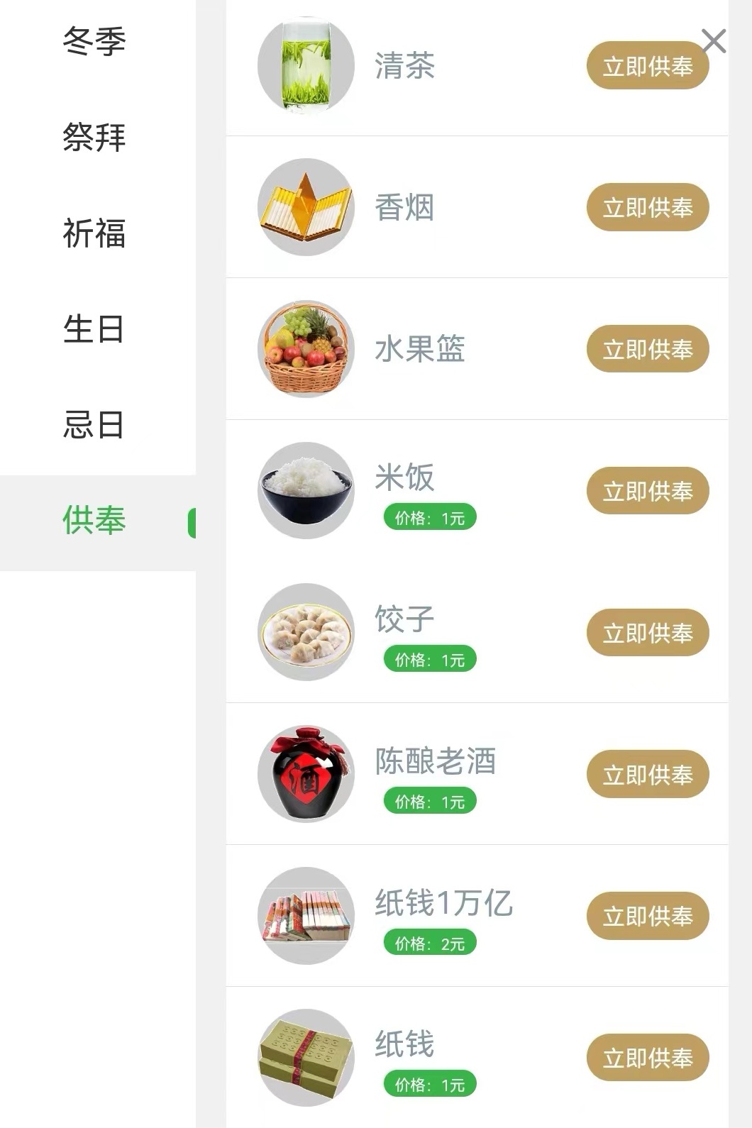 記者發(fā)現(xiàn),用戶免費創(chuàng)建“網(wǎng)上紀念館”后,可以在紀念館進行“祭拜、祈福、獻花、供奉”等虛擬活動。而在推出的這些虛擬服務(wù)中,有些是免費的,有些則要收取費用。比如,在某平臺送出一個“生日快樂”蛋糕,需要微信支付2元,送一疊“忌日紙錢”需要支付1元,一份“米飯”1元。