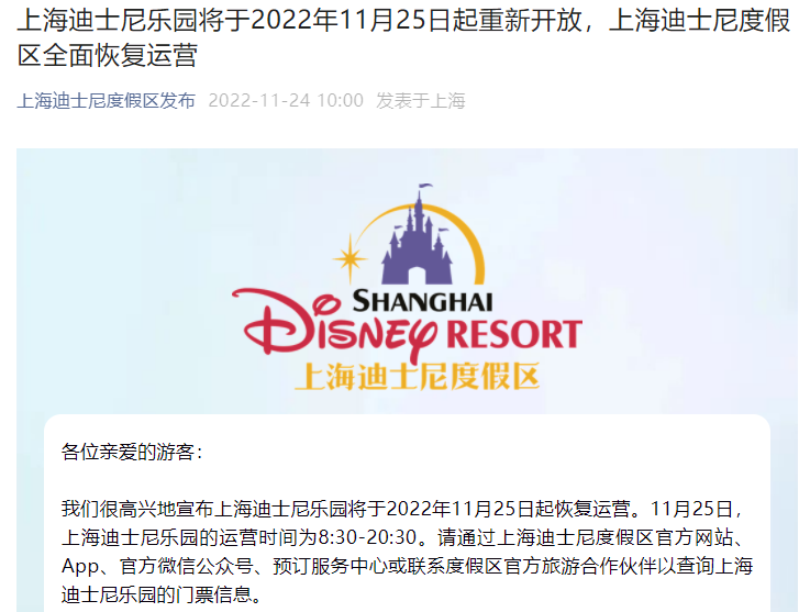 此外,迪士尼小鎮(zhèn)、星愿公園和上海迪士尼樂(lè)園酒店已于日前恢復(fù)運(yùn)營(yíng)。上海迪士尼樂(lè)園和玩具總動(dòng)員酒店的重新開(kāi)放標(biāo)志著上海迪士尼度假區(qū)全面恢復(fù)運(yùn)營(yíng)。