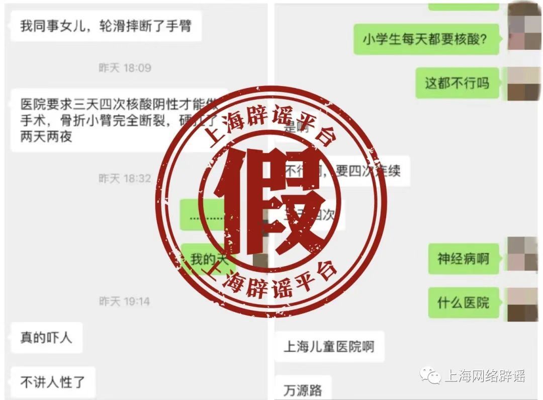 “上海一醫(yī)院要求兒童三天四次核酸才能做手術(shù),孩子骨折小臂斷裂,硬抗了兩天兩夜?!辈痪们?,一條聊天記錄在陸先生的家屬群引發(fā)熱議。因?yàn)楸斫阋患疑钤谏虾?,親戚還特意提醒她照顧好孩子。而很快,官方發(fā)布辟謠消息,稱經(jīng)過多路求證,聊天記錄中所指醫(yī)院并沒有三天四次核酸檢測陰性才能手術(shù)的要求,院方也未核查到存在所傳相似情況的病人。