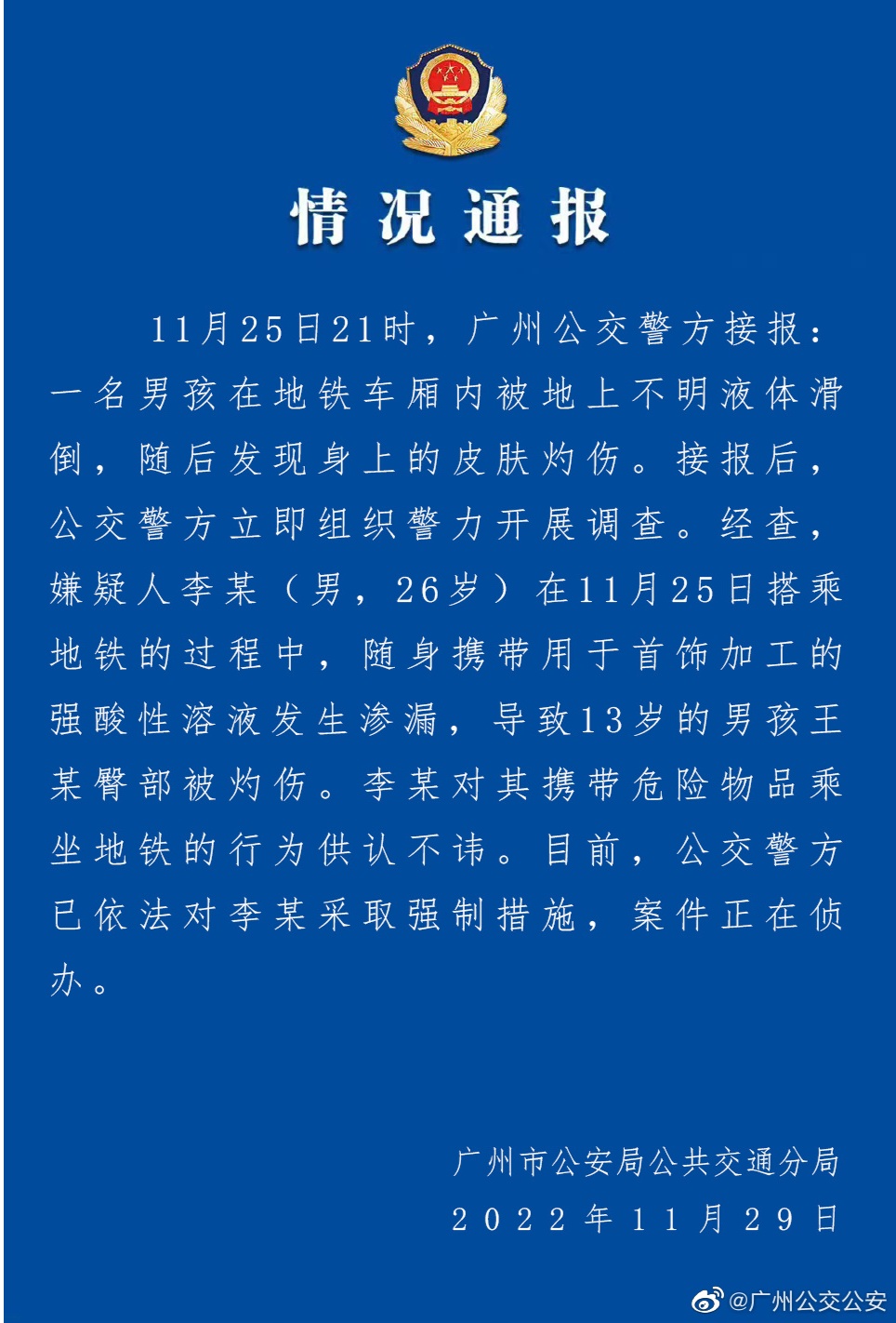 通報(bào)顯示,25日21時(shí),廣州公交警方接報(bào)稱,一名男孩在地鐵車廂內(nèi)被地上不明液體滑倒,隨后發(fā)現(xiàn)身上的皮膚灼傷。接報(bào)后,公交警方立即組織警力開展調(diào)查。經(jīng)查,嫌疑人李某(男,26歲)在11月25日搭乘地鐵的過(guò)程中,隨身攜帶用于首飾加工的強(qiáng)酸性溶液發(fā)生滲漏,導(dǎo)致13歲的男孩王某臀部被灼傷。李某對(duì)其攜帶危險(xiǎn)物品乘坐地鐵的行為供認(rèn)不諱。