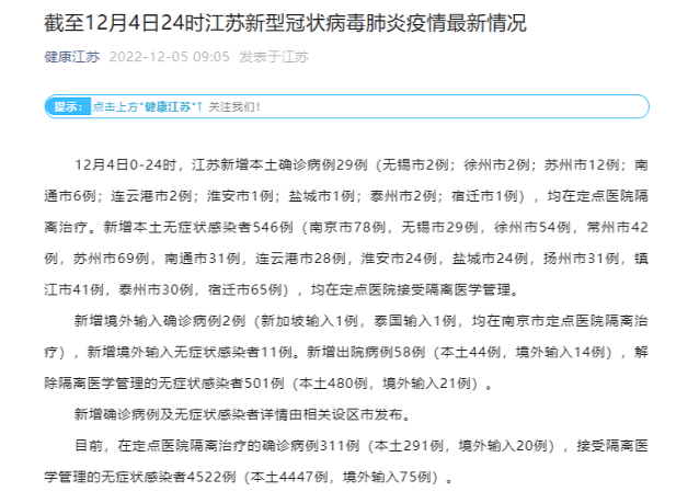 12月4日江蘇新增本土確診29例 新增本土無癥狀546例