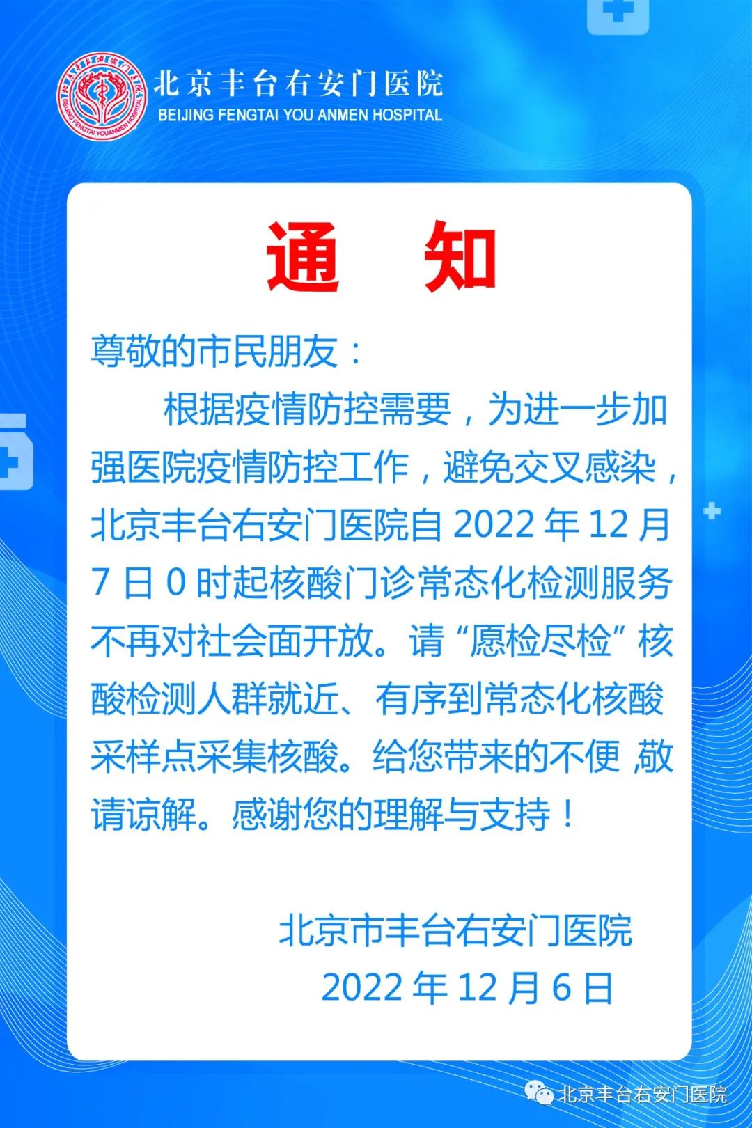 北京豐臺(tái)右安門(mén)醫(yī)院核酸門(mén)診12月7日起停診