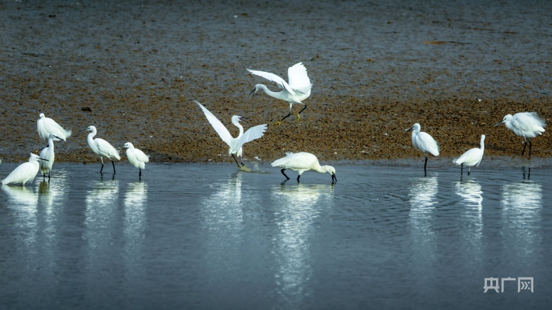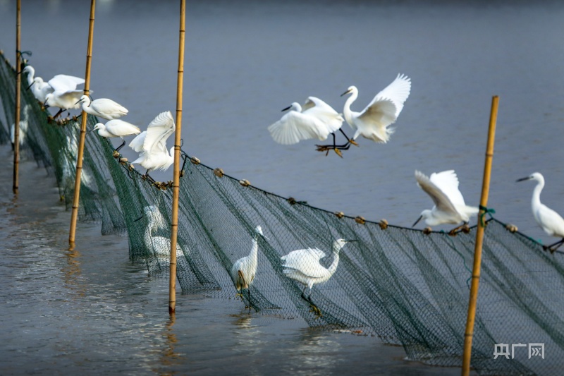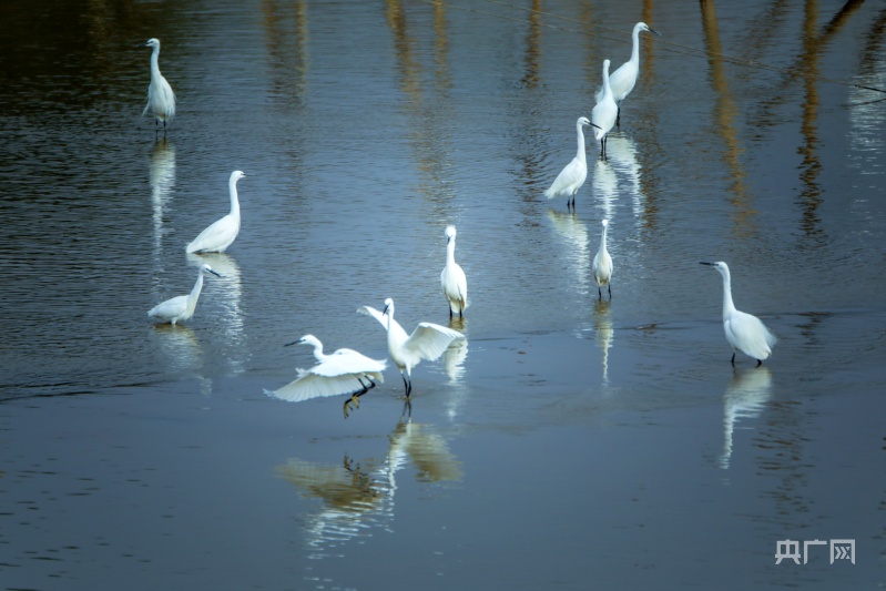 白鷺追逐在湖畔淺灘,捕食著可口的小魚小蝦(央廣網(wǎng)發(fā) 陳扶南 攝)