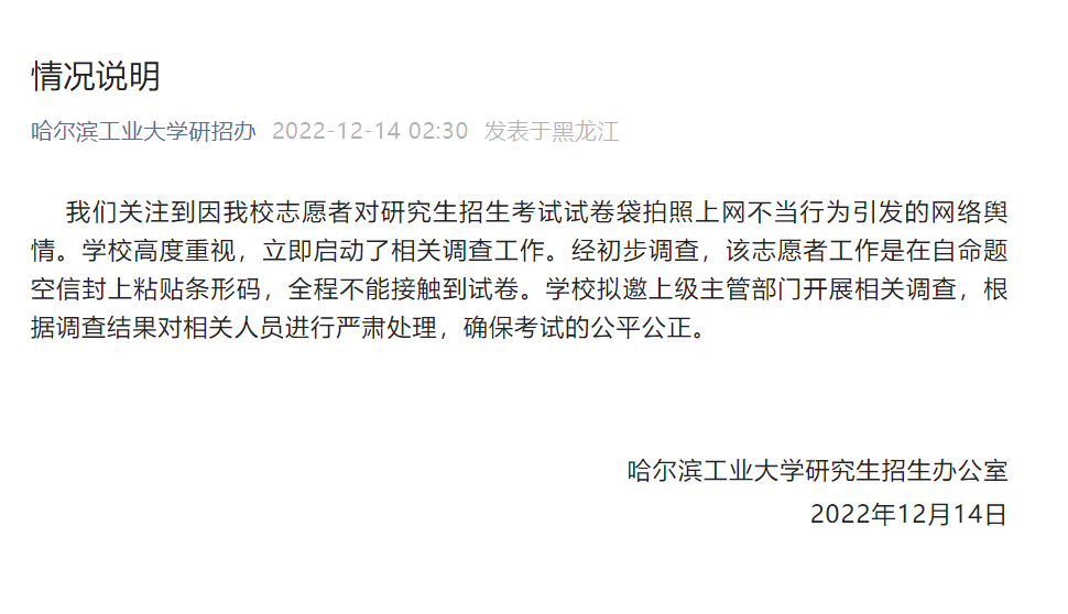 央廣網(wǎng)哈爾濱12月14日消息(記者馬俊瑋)12月14日,哈爾濱工業(yè)大學(xué)研究生招生辦公室通報:我們關(guān)注到因我校志愿者對研究生招生考試試卷袋拍照上網(wǎng)不當行為引發(fā)的網(wǎng)絡(luò)輿情。學(xué)校高度重視,立即啟動了相關(guān)調(diào)查工作。經(jīng)初步調(diào)查,該志愿者工作是在自命題空信封上粘貼條形碼,全程不能接觸到試卷。學(xué)校擬邀上級主管部門開展相關(guān)調(diào)查,根據(jù)調(diào)查結(jié)果對相關(guān)人員進行嚴肅處理,確??荚嚨墓焦?。