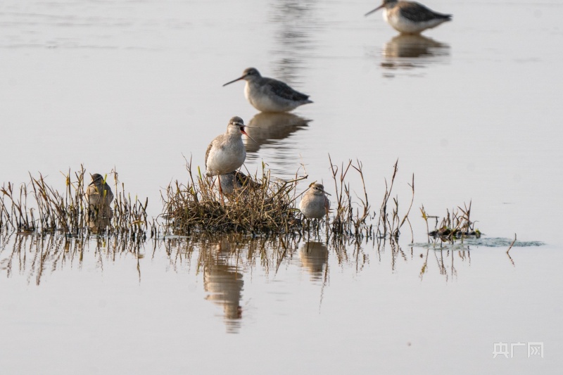 新余市渝水區(qū)水北鎮(zhèn)黃坑村水域,候鳥(niǎo)們?cè)谒墟覒蛞捠常ㄑ霃V網(wǎng)發(fā) 趙春亮 攝)