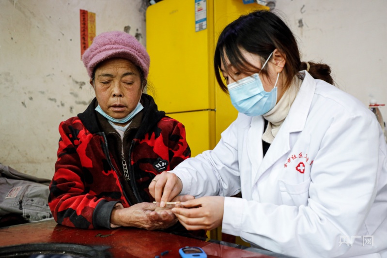 青龍街道金鐘社區(qū)醫(yī)生陳倩為社區(qū)居民測血糖 (央廣網(wǎng)發(fā) 周海東 攝)