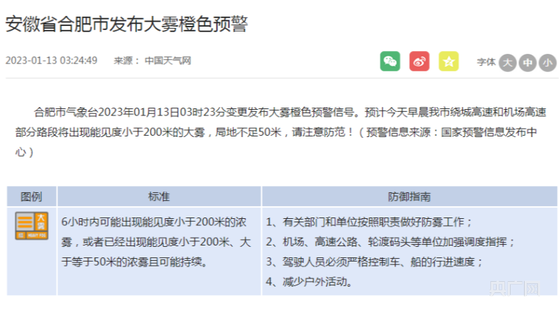 央廣網(wǎng)合肥1月13日消息(記者鮑玉嬋)記者從安徽省氣象局獲悉,合肥市氣象臺2023年01月13日03時23分變更發(fā)布大霧橙色預(yù)警信號。預(yù)計今天早晨我市繞城高速和機(jī)場高速部分路段將出現(xiàn)能見度小于200米的大霧,局地不足50米,請注意防范!