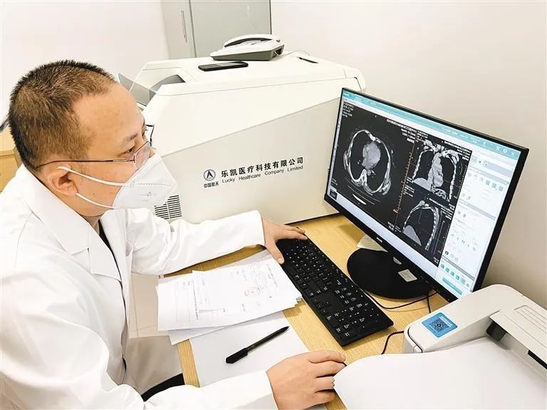 10日上午,在杜城社區(qū)衛(wèi)生服務(wù)中心診室門前,等候拍片的患者不多。在工作人員引導(dǎo)下,大家有序進(jìn)入拍攝區(qū)。診室內(nèi),陜西省康復(fù)醫(yī)院影像一科主任高雅鵬正在一個(gè)看似與普通顯示器沒什么兩樣的電腦前書寫診斷報(bào)告?!氨绕鹨话愕腃T靜態(tài)閱片,在這臺(tái)顯示器的幫助下,我們可以實(shí)現(xiàn)多角度、多方位、動(dòng)態(tài)式閱片,讓診斷更加細(xì)致精準(zhǔn)?!?高雅鵬說,這臺(tái)CT機(jī)的配置完全可以滿足周邊居民對(duì)于肺部CT的拍片需求。