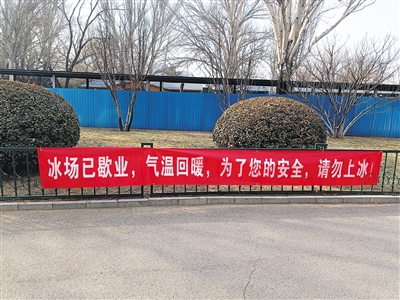 2月5日,玉淵潭公園南門(mén)貼著“請(qǐng)勿上冰”的橫幅。 新京報(bào)記者 彭鏡陶 攝