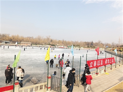 在奧林匹克公園龍形水系旁,記者遇到一對(duì)父子,他們想要推開(kāi)圍擋靠近冰面,被附近的安保人員勸返。這位安保人員告訴記者,去年農(nóng)歷臘月二十八,有人在冰面上玩耍時(shí)落水,此后,相關(guān)管理人員在冰面的所有入口處設(shè)置了圍擋,并安排安保人員每日7點(diǎn)到18點(diǎn)值守,及時(shí)勸阻游玩者。