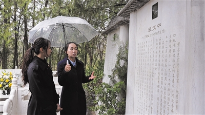 4月4日,周口店北京人遺址科學(xué)家紀(jì)念園,講解員劉博(右)向新京報記者講述考古學(xué)家的事跡。新京報記者 王巍 攝