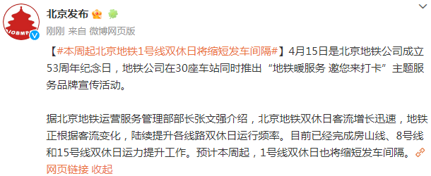 據(jù)北京地鐵運(yùn)營(yíng)服務(wù)管理部部長(zhǎng)張文強(qiáng)介紹,北京地鐵雙休日客流增長(zhǎng)迅速,地鐵正根據(jù)客流變化,陸續(xù)提升各線路雙休日運(yùn)行頻率。目前已經(jīng)完成房山線、8號(hào)線和15號(hào)線雙休日運(yùn)力提升工作。預(yù)計(jì)本周起,1號(hào)線雙休日也將縮短發(fā)車間隔。