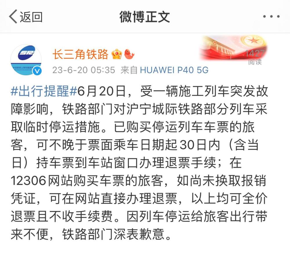 記者6月20日從鐵路上海局獲悉,受一輛施工列車突發(fā)故障影響,鐵路部門對滬寧城際鐵路部分列車采取臨時停運措施。已購買停運列車車票的旅客,可不晚于票面乘車日期起30日內(nèi)(含當日)持車票到車站窗口辦理退票手續(xù);在12306網(wǎng)站購買車票的旅客,如尚未換取報銷憑證,可在網(wǎng)站直接辦理退票,以上均可全價退票且不收手續(xù)費。