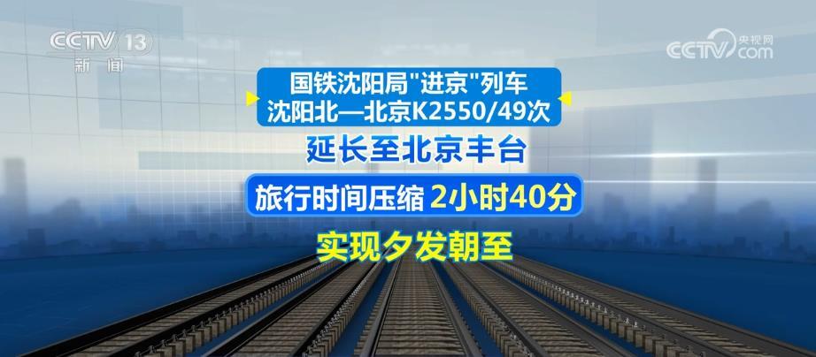 此次調(diào)圖,國(guó)鐵沈陽(yáng)局“進(jìn)京”列車沈陽(yáng)北—北京K2550/49次延長(zhǎng)至北京豐臺(tái),旅行時(shí)間壓縮2小時(shí)40分,實(shí)現(xiàn)夕發(fā)朝至。