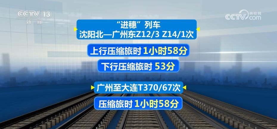 “進(jìn)穗”列車沈陽(yáng)北—廣州東Z12/3、Z14/1次上行壓縮旅時(shí)1小時(shí)58分,下行壓縮旅時(shí)53分,廣州—大連T370/67次壓縮旅時(shí)1小時(shí)58分。