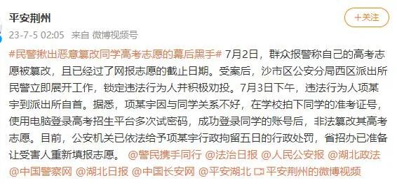 7月2日,湖北荊州,一女生報(bào)警稱自己的高考志愿被篡改,且已經(jīng)過了網(wǎng)報(bào)志愿的截止日期。受案后,沙市區(qū)公安分局西區(qū)派出所民警立即展開工作,鎖定違法行為人并積極勸投。