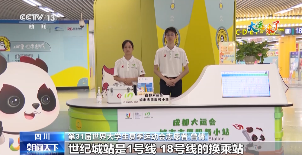 第31屆世界大學(xué)生夏季運(yùn)動(dòng)會(huì)志愿者 曾倩:世紀(jì)城站是1號(hào)線、18號(hào)線的換乘站,平時(shí)的客流量比較大,為了讓大家更好地了解大運(yùn)會(huì)、走進(jìn)大運(yùn)會(huì)。我們提供了一些大運(yùn)會(huì)的咨詢服務(wù)。成都是一座著名的旅游城市,為了讓大家更好地坐地鐵、玩成都、游成都,我們提供了乘車指引――成都地鐵美景地圖。