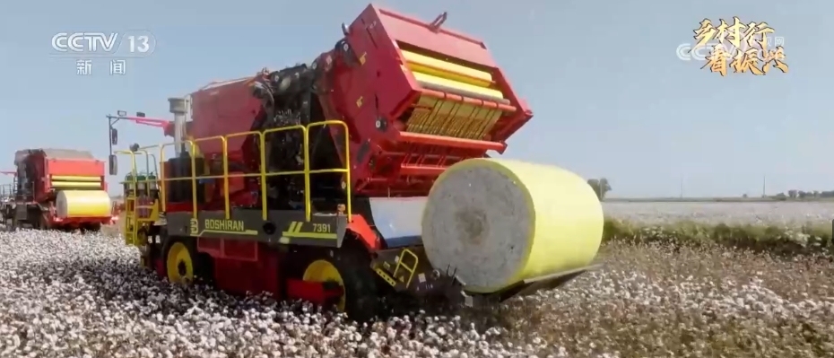 這幾年,新疆絕大部分地區(qū)都已經(jīng)實現(xiàn)了機械化采棉。棉花采收打包一體機,除了自動采棉之外,還有打包的功能,當?shù)厝私o它取了個特別形象的名字叫“下蛋機”。當裝棉花的車廂裝滿后,它的尾部會自動吐出一個大棉包,這個棉包用金黃色包裝膜包裹著,從空中俯瞰像是一枚巨大的“金蛋”,既干凈又方便后續(xù)運輸。這些“下蛋機”是這兩年最新上市的我國自主研發(fā)、自主生產(chǎn)的機器。