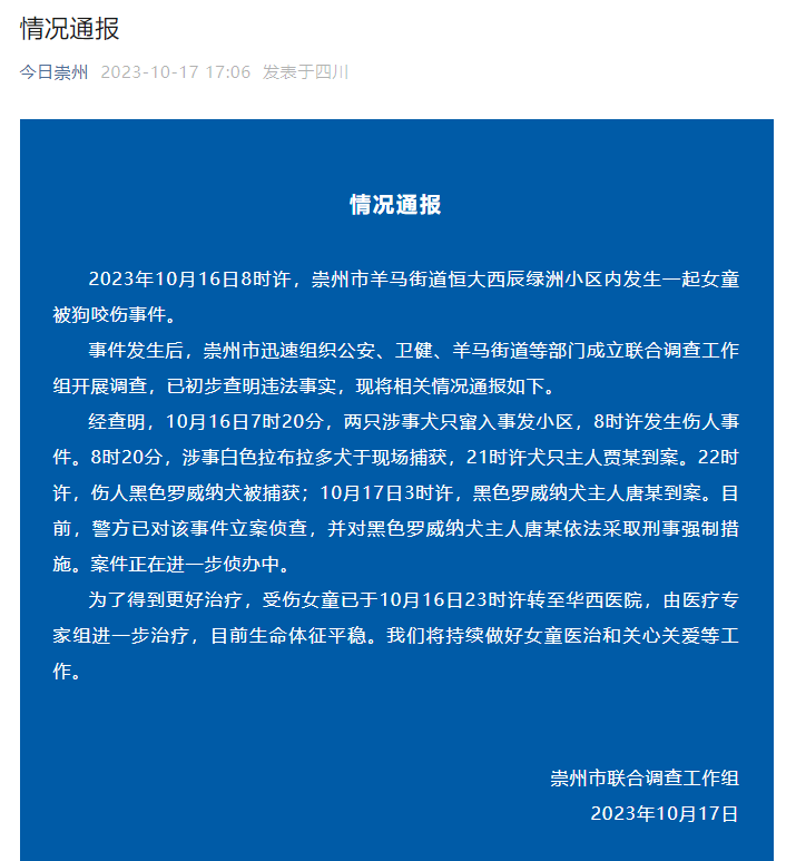 剛剛,“今日崇州”微信公號發(fā)布通報(bào):16日8時(shí)20分,涉事白色拉布拉多犬于現(xiàn)場捕獲,21時(shí)許犬只主人賈某到案。22時(shí)許,傷人黑色羅威納犬被捕獲;10月17日3時(shí)許,黑色羅威納犬主人唐某到案。目前,警方已對該事件立案偵查,并對黑色羅威納犬主人唐某依法采取刑事強(qiáng)制措施。案件正在進(jìn)一步偵辦中。