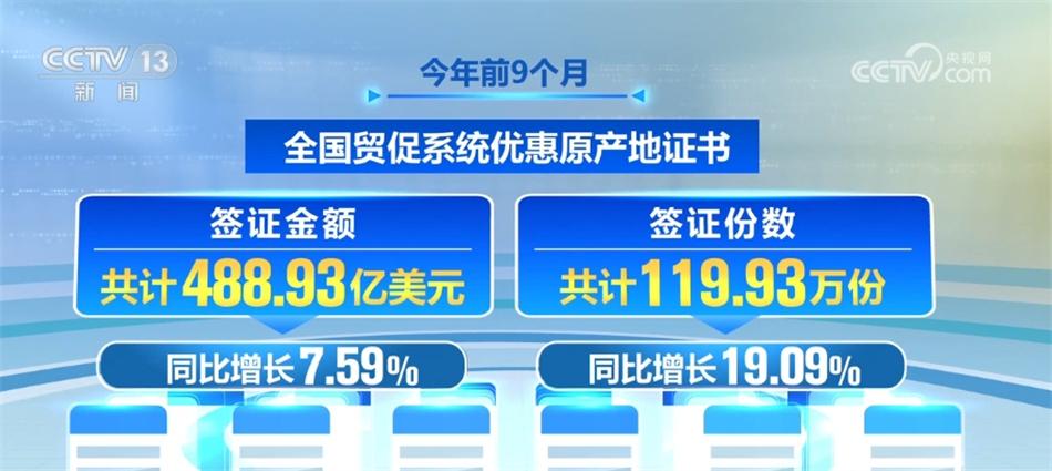 數(shù)據(jù)顯示,今年前9個月,全國貿(mào)促系統(tǒng)累計(jì)簽發(fā)原產(chǎn)地證書、ATA單證冊、商事證明書等各類證書455.06萬份,較上年同比增長13.39%。