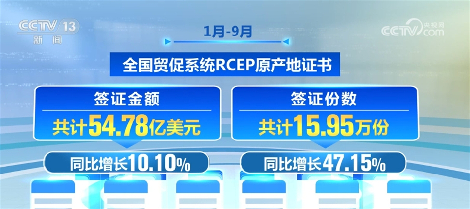 1月—9月,全國貿(mào)促系統(tǒng)RCEP原產(chǎn)地證書簽證金額共計(jì)54.78億美元,同比增長10.10%;簽證份數(shù)共計(jì)15.95萬份,同比增長47.15%。