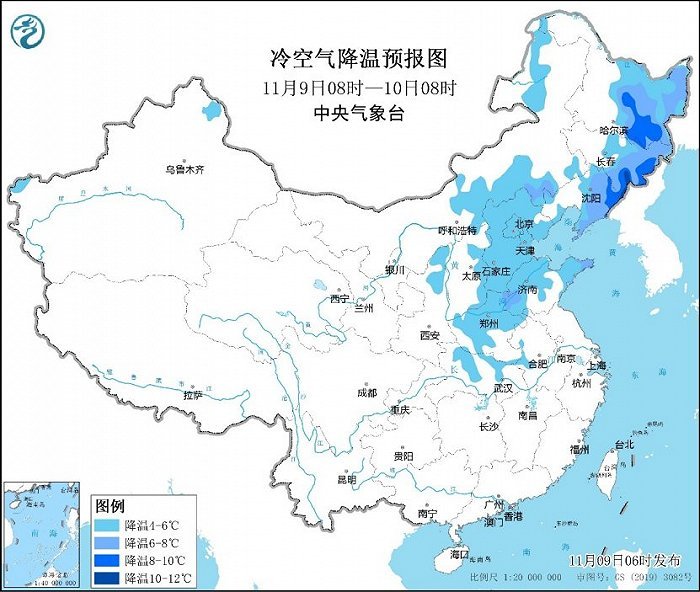 受冷空氣影響,9-13日,中東部地區(qū)將自北向南先后出現(xiàn)大風(fēng)降溫天氣,大部地區(qū)過程累計(jì)降溫幅度有6~10℃,黑龍江東部、吉林東部以河南、湖北、湖南、貴州和廣西等地的部分地區(qū)降溫可達(dá)12℃以上;南方地區(qū)強(qiáng)降溫主要出現(xiàn)在10-13日;13日前后最低氣溫0℃線位于山東中南部-河南北部一線,江淮地區(qū)最低氣溫5℃左右。