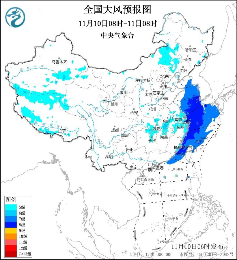 預(yù)計(jì),11月10日08時(shí)至11日08時(shí),內(nèi)蒙古中東部、遼寧西部、安徽中南部、河南南部、江蘇南部、上海、湖北南部、湖南東北部、江西北部、浙江北部及東部沿海、福建沿海、臺灣島沿海等地有5~6級、陣風(fēng)7~8級的大風(fēng);黃海大部海域、東海大部海域、臺灣海峽、臺灣以東洋面偏北海域、南海東北部偏北海域?qū)⒂?~8級、陣風(fēng)9~10級的大風(fēng)。