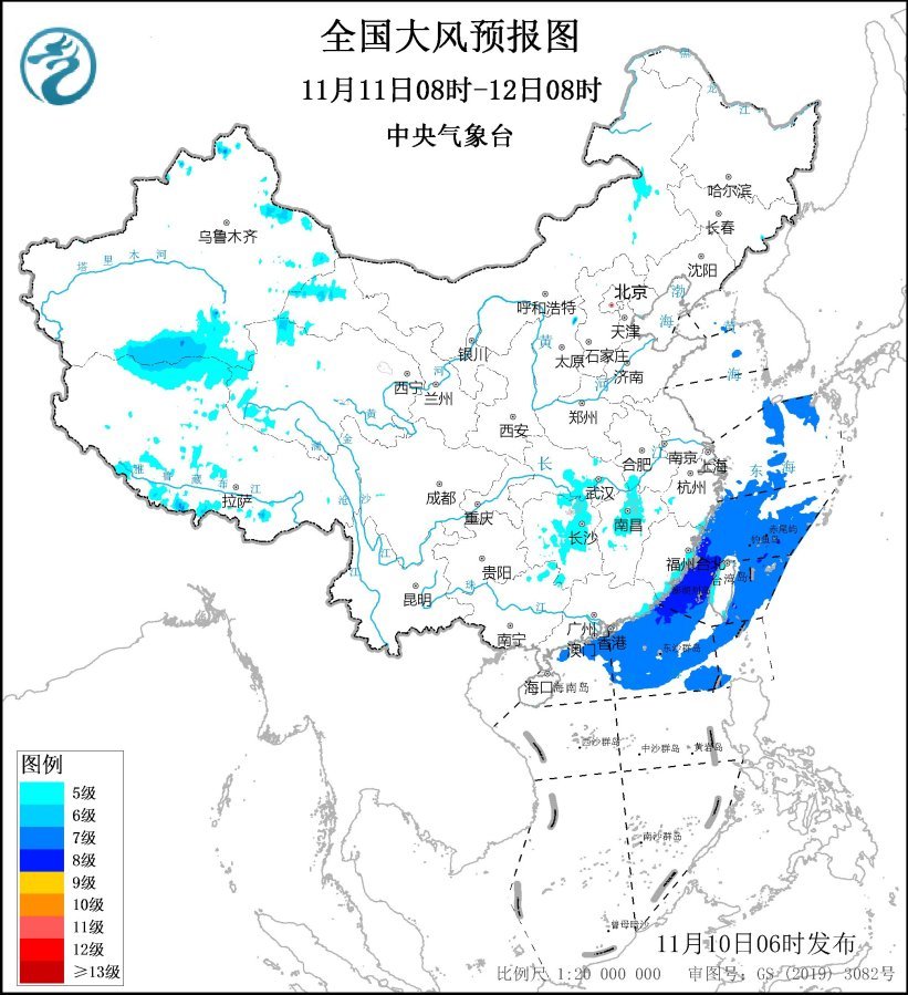11月11日08時(shí)至12日08時(shí),安徽南部、湖北中東部、湖南大部、江西中北部、廣西東北部以及福建沿海、廣東東部沿海、臺灣島沿海等地有5~6級、陣風(fēng)7~8級的大風(fēng);東海大部海域、臺灣海峽、臺灣以東洋面、南海北部海域、巴士海峽偏北海域?qū)⒂?~8級、陣風(fēng)9~10級的大風(fēng)。