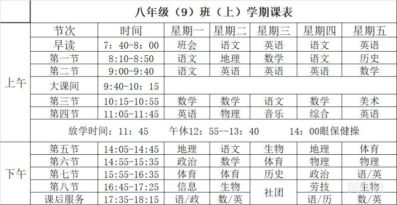 西安市某中學(xué)初二學(xué)生的課程表(央廣網(wǎng)發(fā) 受訪者供圖)