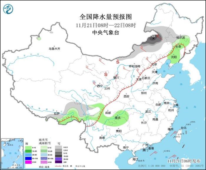 11月21日08時至22日08時,內(nèi)蒙古東部、黑龍江西南部、吉林西部等地部分地區(qū)有小到中雪或雨夾雪,其中,內(nèi)蒙古東部局地有大到暴雪(10~12毫米)。吉林中部、遼寧大部、西藏東南部、四川盆地南部、重慶大部、貴州北部、云南東北部等地部分地區(qū)有小雨。西北地區(qū)中部和東北部、內(nèi)蒙古大部、華北西部和北部等地部分地區(qū)有4~6級風(fēng)。內(nèi)蒙古河套地區(qū)、甘肅河西等地局地有揚沙(見圖6)。