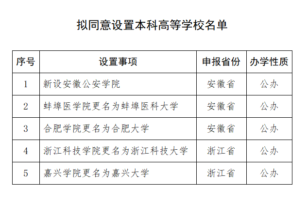 本次擬設置本科高校中,1所高校為新設,4所本科高校更名。具體名單如下: