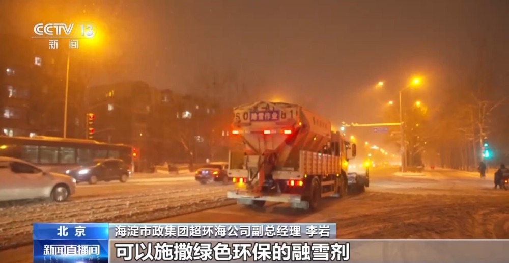 海淀市政集團超環(huán)海公司副總經(jīng)理 李巖:通過人機配合的工作模式,縮短道路恢復(fù)的時間。大型的機械設(shè)備,主要是多功能除雪車,前面有滾刷,可以將雪打碎,后面有撒布設(shè)備,可以施撒綠色環(huán)保的融雪劑。