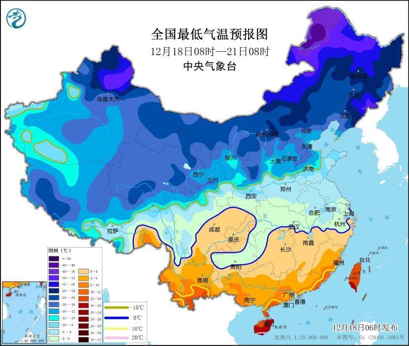 圖2 全國最低氣溫預(yù)報(bào)圖(12月18日08時(shí)-21日08時(shí))