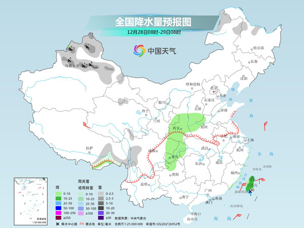 后天,內蒙古東北部、黑龍江西北部、新疆北部、西藏東部等地部分地區(qū)有小雪或雨夾雪,其中,新疆北疆北部和沿天山地區(qū)等地部分地區(qū)有中到大雪。西北地區(qū)東部、華北南部、黃淮西部、西南地區(qū)東部、臺灣島等地部分地區(qū)有小到中雨,其中,臺灣島等地部分地區(qū)有大雨。