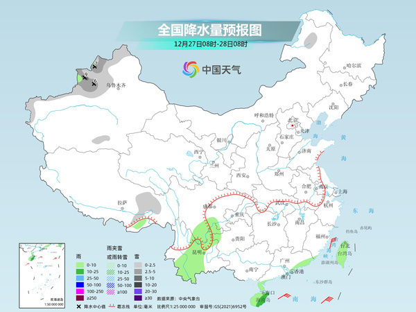 明天,內蒙古東北部、新疆北部和南疆西部山區(qū)、西藏東部等地部分地區(qū)有小到中雪或雨夾雪,其中,新疆北疆北部和伊犁河谷等地部分地區(qū)有大雪。云南中部、廣東東南部沿海、海南島、臺灣島等地部分地區(qū)有小到中雨。