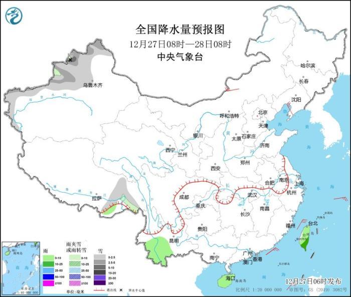 12月27日08時(shí)至28日08時(shí),新疆北部、西藏東南部等地部分地區(qū)有小雪或雨夾雪,其中,新疆北疆北部和伊犁河谷等地部分地區(qū)有中到大雪,局地暴雪(10~12毫米)。云南西南部和中部、海南島、臺(tái)灣島等地部分地區(qū)有小雨,其中,臺(tái)灣島東部和南部等地部分地區(qū)有中雨。內(nèi)蒙古中東部、遼東半島等地部分地區(qū)有4~5級(jí)風(fēng)(見(jiàn)圖1)。