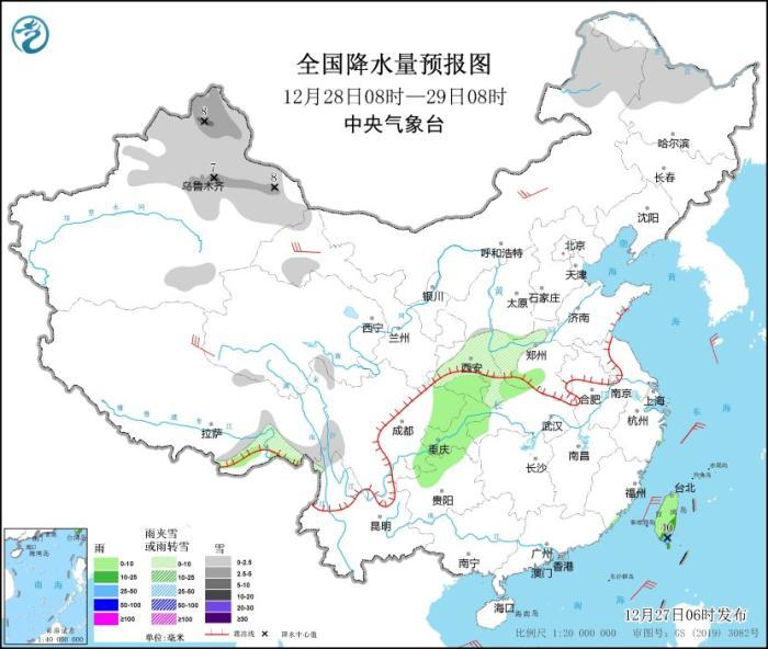 12月28日08時(shí)至29日08時(shí),新疆北部、內(nèi)蒙古東北部、黑龍江西北部、西藏東南部、陜西中部等地部分地區(qū)有小雪或雨夾雪,其中,新疆沿天山地區(qū)和北疆北部等地部分地區(qū)有中到大雪(5~8毫米)。陜西南部、河南南部、西南地區(qū)東部、臺(tái)灣島等地部分地區(qū)有小到中雨,其中,臺(tái)灣島東部和南部等地部分地區(qū)有大雨(25~40毫米)。青海西部、甘肅河西、內(nèi)蒙古中部等地部分地區(qū)有5~6級(jí)風(fēng)(見(jiàn)圖2)。