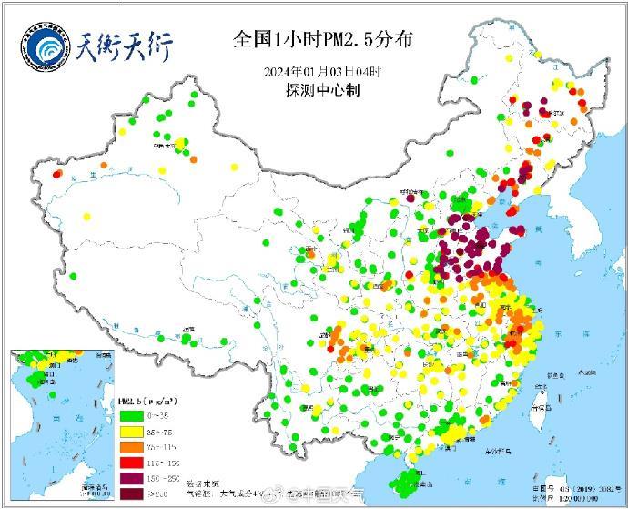 據(jù)中國氣象局氣象探測中心綜合觀測產(chǎn)品系統(tǒng)(天衡天衍)產(chǎn)品顯示,根據(jù)1月3日04時全國時均PM10、PM2.5分布圖,河北、山東、長三角、川渝等地區(qū)PM10、PM2.5濃度較高。最大PM10出現(xiàn)在山東青島站,為285微克/立方米。最大PM2.5出現(xiàn)在山東淄博站,為272.6微克/立方米。以上地區(qū)PM10大都超過150微克/立方米;PM2.5大都超過115微克/立方米。