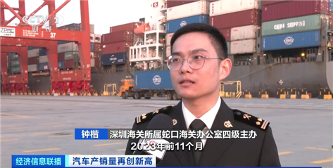 深圳海關所屬蛇口海關辦公室四級主辦 鐘楷:疊加提前申報抵港直裝,最大程度為企業(yè)降本提速。2023年前11個月,深圳市一共出口小汽車206.3億元,同比增長2倍多;其中電動載人汽車190.8億元,占汽車出口總值的92.5%。