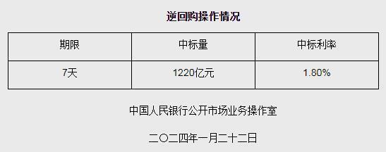 中新網(wǎng)1月22日電 據(jù)央行網(wǎng)站消息,為維護銀行體系流動性合理充裕,2024年1月22日人民銀行以利率招標(biāo)方式開展了1220億元逆回購操作,中標(biāo)利率1.80%,期限為7天。具體情況如下:
