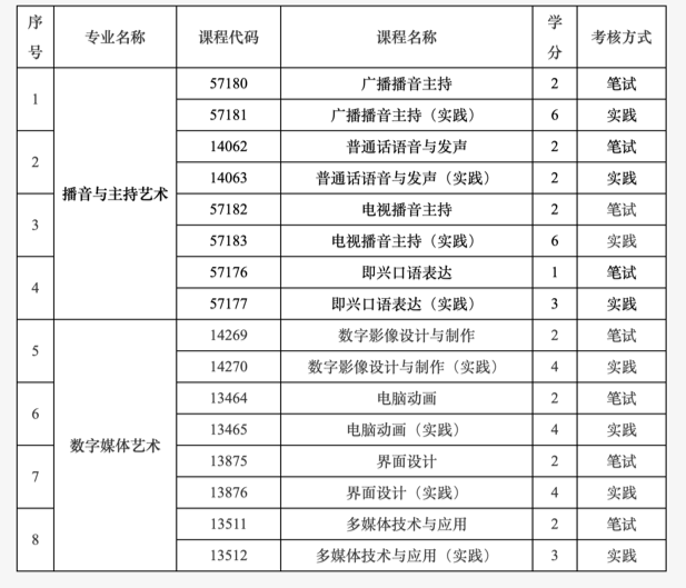 3. 調(diào)整播音與主持藝術(shù)專業(yè)(專升本)、數(shù)字媒體藝術(shù)專業(yè)(專升本)2個專業(yè)中8門課程(見下表),筆試和實踐均納入到“非筆試及實踐類課程”進行報考,由主考學校組織考試。
