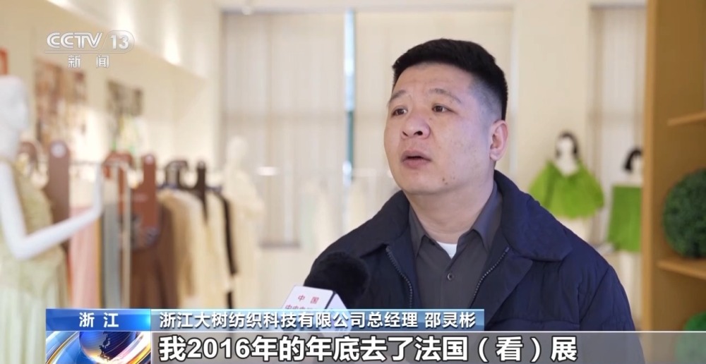浙江大樹紡織科技有限公司總經(jīng)理 邵靈彬:我2016年的年底去了法國看展,基本上是奢侈品買面料的一個(gè)展會。我當(dāng)時(shí)給自己設(shè)的一個(gè)夢想,10年之內(nèi)我想進(jìn)展會。