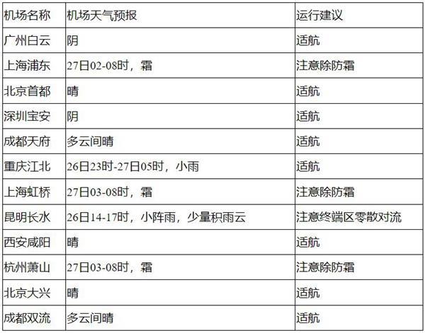 26日中午至27日中午,全國大部機(jī)場適航,27日凌晨至早間,哈爾濱、長春、沈陽、青島、南京、合肥、虹橋、浦東、杭州等機(jī)場有霜;另外,26日午后,云南中南部航路有分散對流。