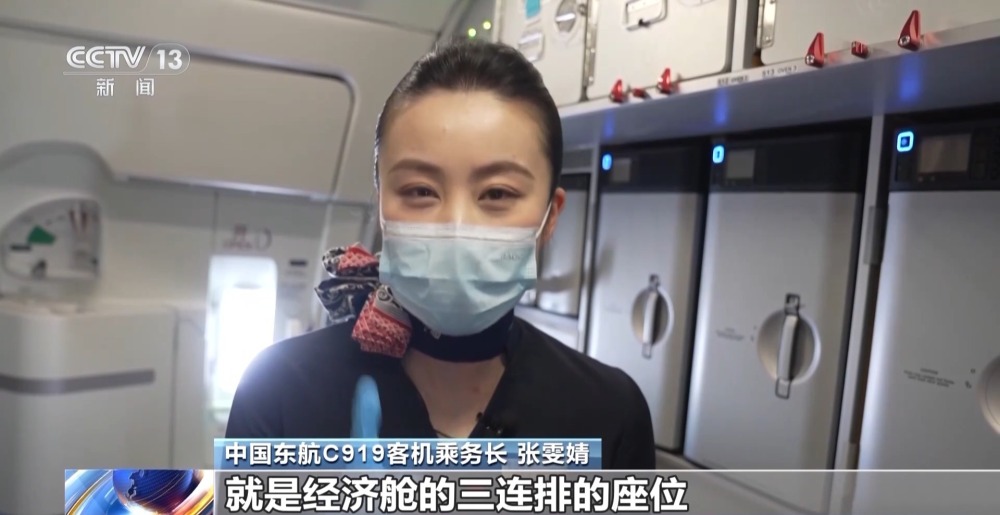 中國東航C919客機(jī)乘務(wù)長 張雯婧:我們非常特別的一點就是經(jīng)濟(jì)艙的三連排的座位,它要比其他的飛機(jī)中間座位更寬一點,寬1.5厘米。