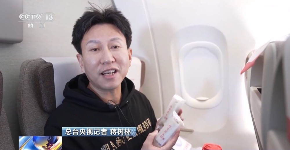 總臺央視記者 蔣樹林:首先是這個大白兔的紅豆風(fēng)味的牛奶,這還是我頭一次看到這樣的口味。還有這個桂花條頭糕,是上海老字號出產(chǎn)的??梢哉f這個小小的餐盤把上海的土特產(chǎn),搬到了C919飛機(jī)上。