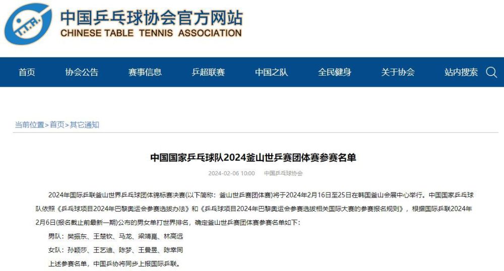 北京時(shí)間2月6日,中國(guó)乒協(xié)官網(wǎng)發(fā)布了中國(guó)國(guó)家乒乓球隊(duì)釜山世乒賽團(tuán)體賽參賽名單。中國(guó)國(guó)家乒乓球隊(duì)依照《乒乓球項(xiàng)目2024年巴黎奧運(yùn)會(huì)參賽選拔辦法》和《乒乓球項(xiàng)目2024年巴黎奧運(yùn)會(huì)參賽選拔相關(guān)國(guó)際大賽的參賽報(bào)名規(guī)則》,根據(jù)國(guó)際乒聯(lián)2024年2月6日(報(bào)名截止前最新一期)公布的男女單打世界排名,確定釜山世乒賽團(tuán)體賽參賽名單如下: