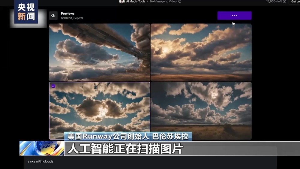 美國Runway公司創(chuàng)始人 巴倫蘇埃拉:讓我們做一個有云的天空,我可以選擇電影風格或預覽角度。我真的很喜歡這張,它看起來就像光是從云里出來的。人工智能正在掃描圖片,并由此生成一段視頻。你現(xiàn)在可以看到云正在移動,天空正在變暗,暴風雨就要來了。