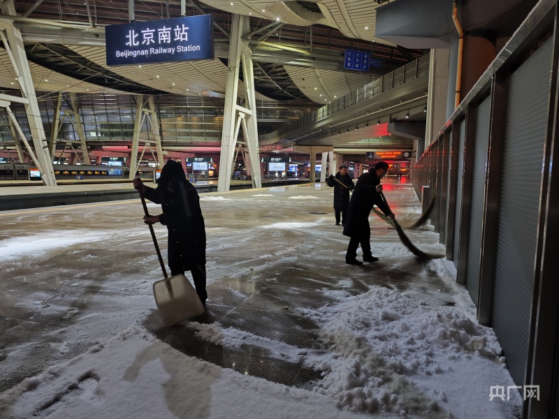 北京南站第一時間啟動預(yù)警和應(yīng)急響應(yīng),組織除雪突擊隊及時清掃站臺等處的積雪,確保旅客乘降安全。