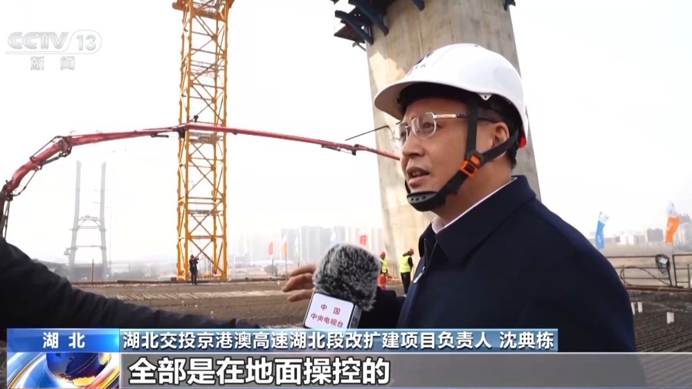 湖北交投京港澳高速湖北段改擴建項目負責人 沈典棟這個塔頂上就是輕型智能筑塔機,是采用智能建造的技術(shù),全都是在地面操控的,塔上無人,這樣就保證了我們工人安全。我們這個智能的布料系統(tǒng),布料很均勻,讓混凝土不產(chǎn)生離析。